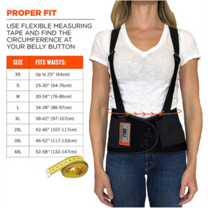 The Ergodyne ProFlex 100 Economy Spandex Back Support is designed to remind workers of proper lifting techniques while also enhancing the body’s intra-abdominal pressure, moving the stress away from the spine for back pain relief. Features rubber track webbing to help keep support in position. SIZING To choose your size, use flexible measuring tape and find the circumference around your body at your belly button. The support should fit snugly around your hips with the front of the support two-fingers width below your navel. An easy-to-use hook & loop closure keeps the belt securely fastened while in use and can be worn over or underneath clothing. Adjust the suspenders straps to fit securely on your shoulders without causing tension. Turn it into a back support belt by simply detaching the shoulder straps from the belt. HOW IT WORKS Ergodyne ProFlex Back Supports provide lower back support and abdominal support for lifting heavy objects. Tightening the back support belt enhances the body’s intra-abdominal pressure and moves the stress away from the spine. When the back support is on correctly, the worker will have additional support for lifting and is more likely to use proper posture. When not lifting, be sure to loosen the belt. Great for airport luggage handlers, warehouse/distribution employees, material handling, construction crews, maintenance, assembly/fabrication, landscaping/grounds and jobs that require heavy lifting. We cannot guarantee that wearing a back brace will prevent workplace injury or be a cure for lower back pain, but when used properly these supports will provide extra lumbar support, promote proper lifting techniques and help you through a workday of bending, twisting, and schlepping. Rest assured, we got your back